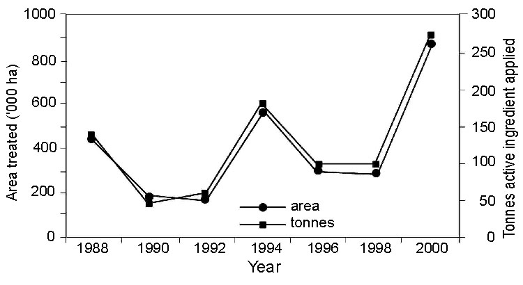 Fig. 1 Twelve year trend in molluscicide usage in U.K.