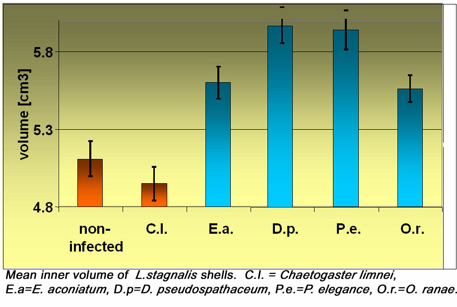 The shells of Lymnaea stagnalis show great variability. It has been described as an effect of environment influence. The main object of the present study was a comparison of some biometric data of shell in naturally infected and uninfected snails from different lakes in the north part of Poland. The height of shell, the height of spiral, the width of shell and the internal volume of shell were measured.