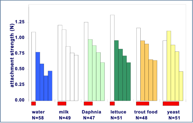 The highest attachment strength was observed in the mussels fed on yeast. Thus, we assume that it seems to be a good choice as a low-cost and low-effort diet, which can be used for short-time culture of zebra mussels. We are also planning further experiments to find the optimum yeast concentration and application procedure.