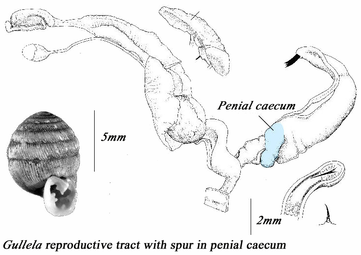 Conchiolinous hooks or spines on the penis are a putative synapomorphy of the near-circumtropical land-snail family Streptaxidae. To date, great variation in form, number, and arrangement of hooks has been found in the species that have been examined. The taxonomic usefulness of these structures is being explored, although their biological significance remains poorly understood.