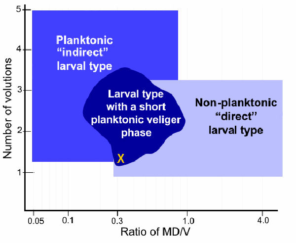 Fig. 3. Relation of whorl number to MD/V, a ratio determined to be one of several lines of evidence from which to infer a gastropod's development mode. The X indicates K. kelletii. Based on Shuto (1974). | ![]() |