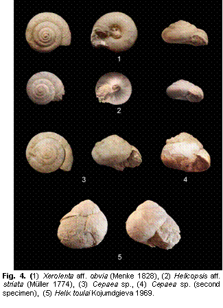 2. Land malacofauna (Fig. 4) Xerolenta aff. obvia (Menke 1828) 1 broken specimen from locality 1. Morphology similar to small individuals of the recent Xerolenta obvia (Menke 1828). Stratigraphic level: Unknown, possibly from the stratum of Helicopsis aff. striata. Helicopsis aff. striata (Müller 1774) 3 specimens (1 entire) from locality 1; 1 fragmented specimen from locality 2. Morphology similar to recent Helicopsis striata (Müller 1774). Stratigraphic level: Found with Helix toulai so possibly Middle/Upper Sarmatian. Cepaea sp. 2 fragmentary specimens from locality 1. Morphology and size as recent Cepaea nemoralis (Linnaeus 1758). Stratigraphic level: Found with Helcopsis aff. striata so possibly Middle/Upper Sarmatian. Helix toulai Kojumdgieva 1969. 5 from locality 1, 2 from locality 2, 4 from locality 3. Stratigraphic level: Middle and Upper Sarmatian.