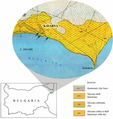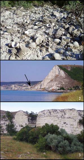 Fig. 2. Views of the three localities. Location 1 is a horizontal rock surface with a lot of Sarmatimactra vitaliana shells beneath an old Thracian Hill, north from the central beach of Kavarna. N 43° 25' 09.1'' E 28° 20' 53.6'. Location 2 is on the coastal area west from the central beach of Kavarna. N 43° 24' 45.1'' E 28° 20' 36.4'';Location 3 is below high cliffs on the coastal area east from the central beach of Kavarna. N 43° 24' 37.3'' E 28° 21' 51.9''. |