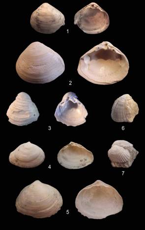 Fig. 3. (1) Sarmatimactra eichwaldi (Laskarev 1914), (2) Sarmatimactra vitaliana (d`Orbigny 1844), (3) Sarmatimactra bulgarica (Toula 1892), (4) Sarmatimactra podolica (Eichwald 1830), (5) Sarmatimactra caspia (Eichwald 1841), (6) Cerastoderma cf. balcicense (Gillet 1938), (7) Cerastoderma kolesnikovi kavarnense (Kojumdgieva 1969). |