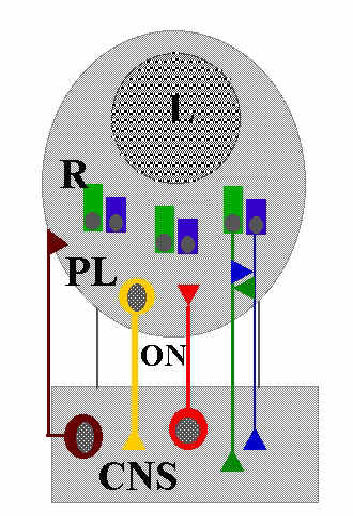 The important conclusions from these studies are that the retina is composed of two types of neurons: photoreceptors and retinal neurons; photoreceptors are united into an morphological network and may be coupled electrically; the central neurons send their projections into the eye via the optic nerve and the eye capsule is innervated through both the optic nerve and separate nerve branches (Fig. 1).